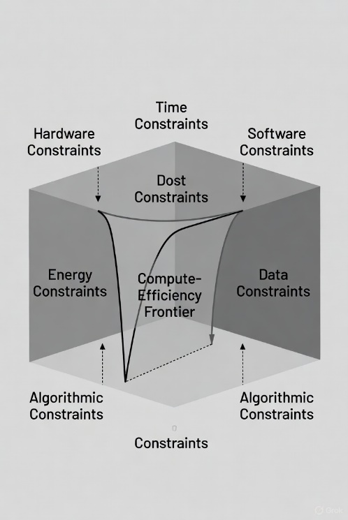 The six walls define a multidimensional constraint surface—an empirical boundary beyond which performance no longer scales with investment. This surface is the Compute‑Efficiency Frontier (CEF): the point where marginal gain in capability per unit cost, power, or data approaches zero. It is observed in the flattening of model‑loss curves and the under‑utilization of capital equipment.