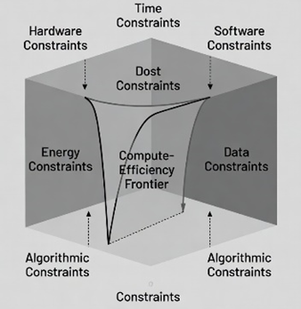 The confluence of these constraints defines the Compute-Efficiency Frontier (CEF), where the derivative of capability with respect to cost approaches zero: