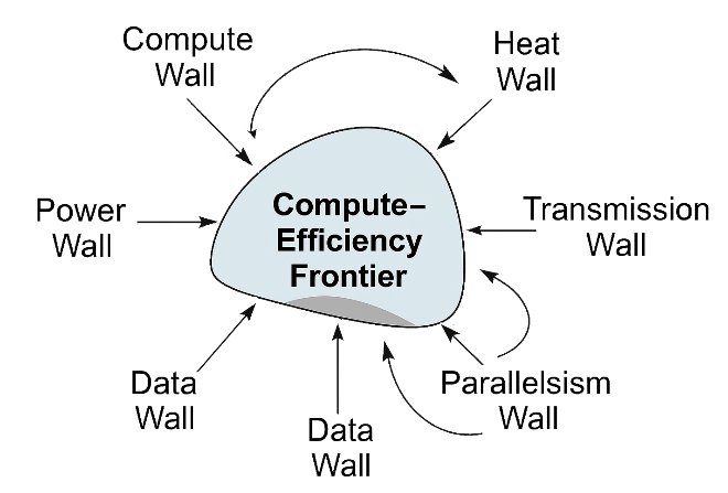 Theoretical Foundations: The Compute Wall arises from transistor miniaturization and interconnect delays, yielding sublinear performance with core count. The Power Wall stems from Landauer’s limit and current density ceilings, bounding energy per operation. The Heat Wall enforces thermal equilibrium via Fourier’s law, capping dissipation per unit area. The Data Wall reflects Shannon entropy saturation in corpora, reducing signal yield with volume. The Parallelism Wall follows Amdahl’s law, with synchronization overhead dominating at scale. The Transmission Wall is dictated by propagation speed, introducing latency floors in distributed systems. These walls interact topologically, forming a convex frontier where capability derivatives vanish.